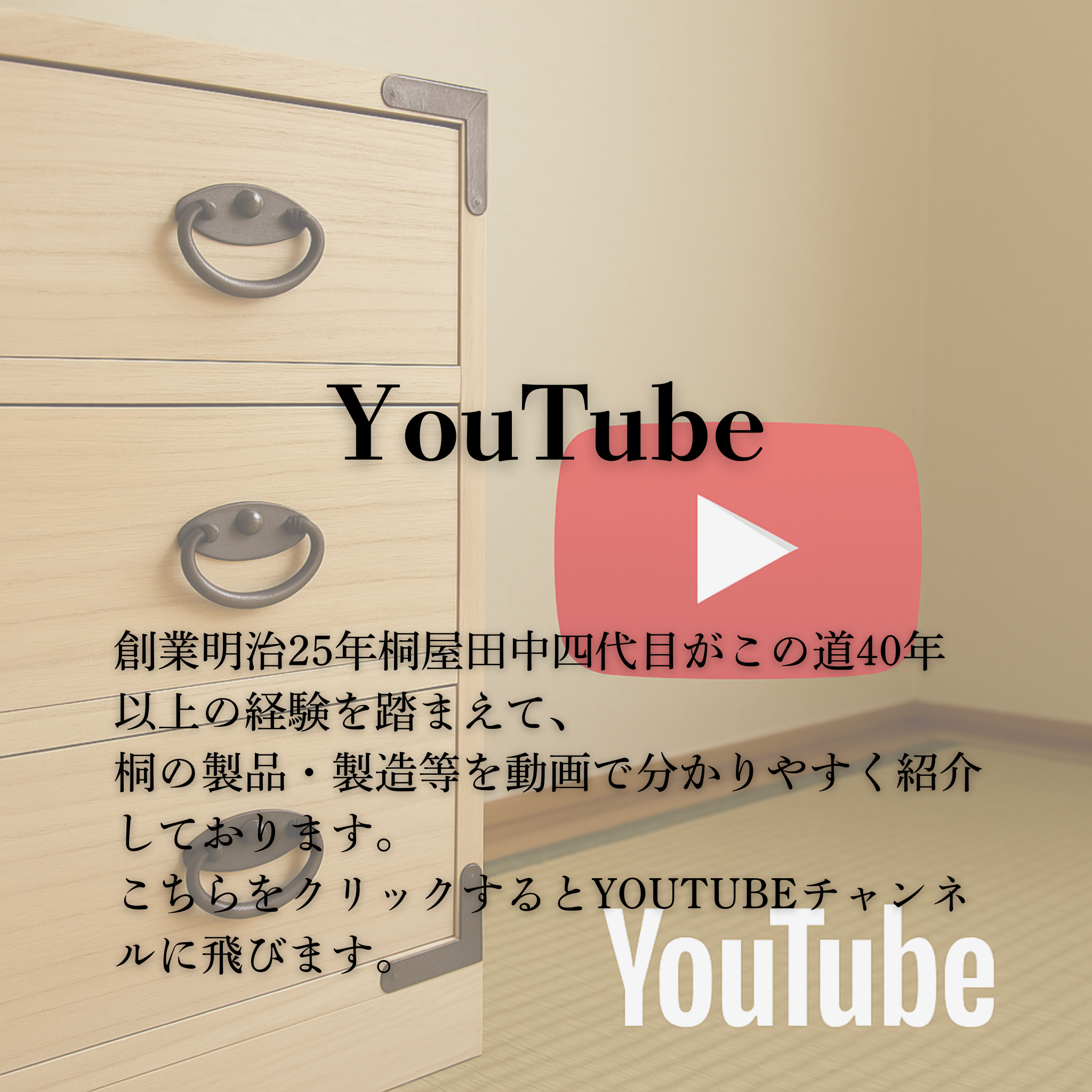 桐にはたくさんの特徴があるので、その特徴を生かして様々な 形で家具として使われています。桐家具で最も代表的なのは桐たんす。その他にも、桐箱や桐椅子などが挙げられます。桐屋田中では、桐の良さを十分に理解し、最大限に生かす商品を製造しております。
