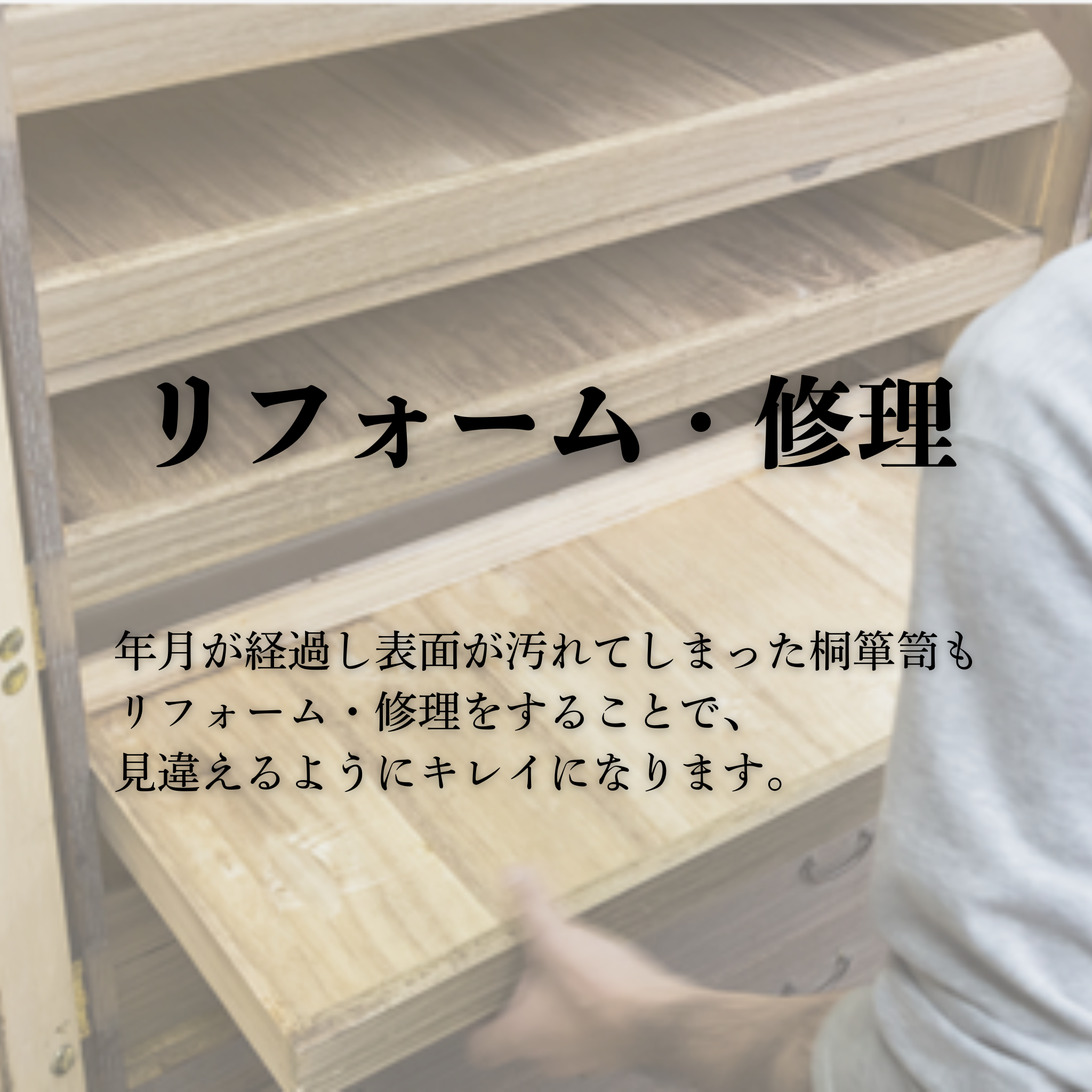 上記の「リフォーム&修理」をクリックして頂くと詳しく記載がございます。桐のリフォームに関しましてお問い合わせ、もしくはお電話(0120-72-1001)で承っておりますのでまずはお気軽にご連絡ください。
