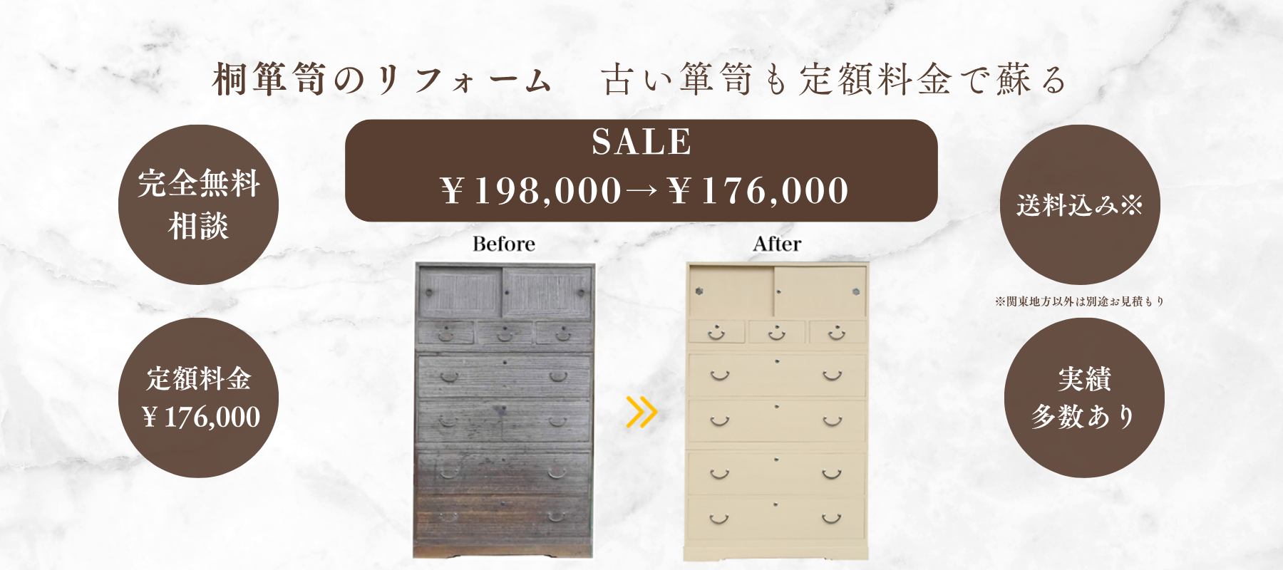 上記の「リフォーム&修理」をクリックして頂くと詳しく記載がございます。桐のリフォームに関しましてお問い合わせ、もしくはお電話(0120-72-1001)で承っておりますのでまずはお気軽にご連絡ください。