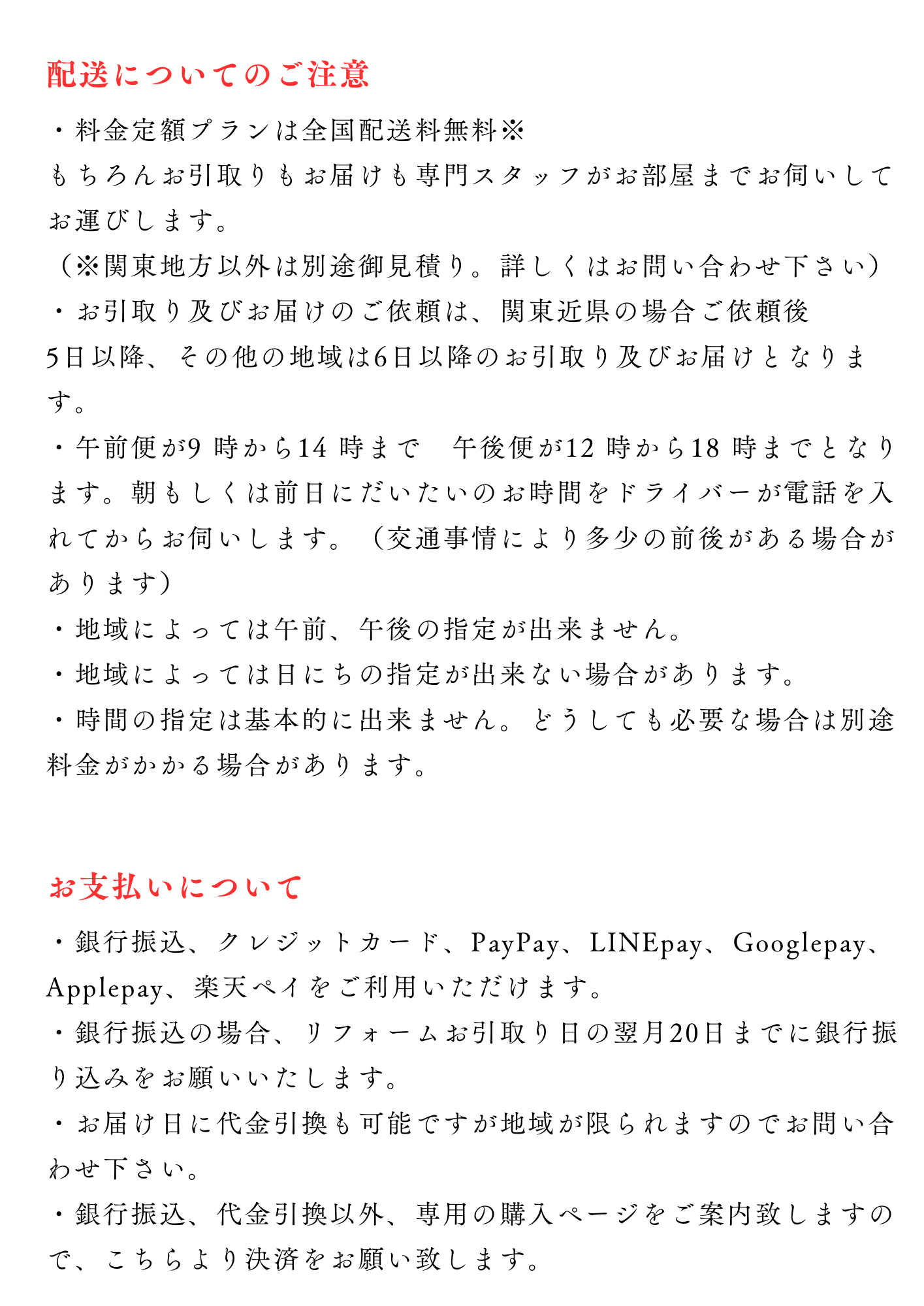 北海道、九州、四国、沖縄、その他離島を除きまして日本全国送料は無料です。もちろんお引取りもお届けもお部屋まで伺ってちゃんと設置まで致します。