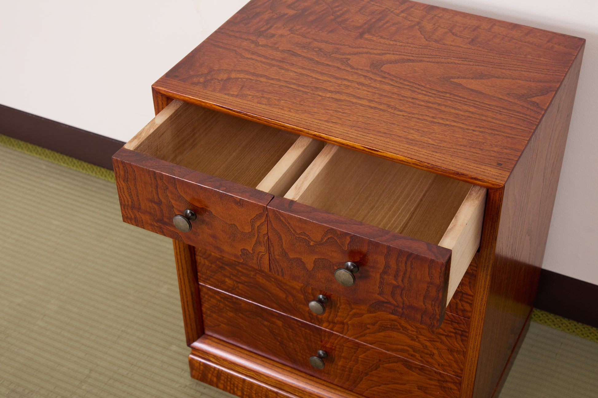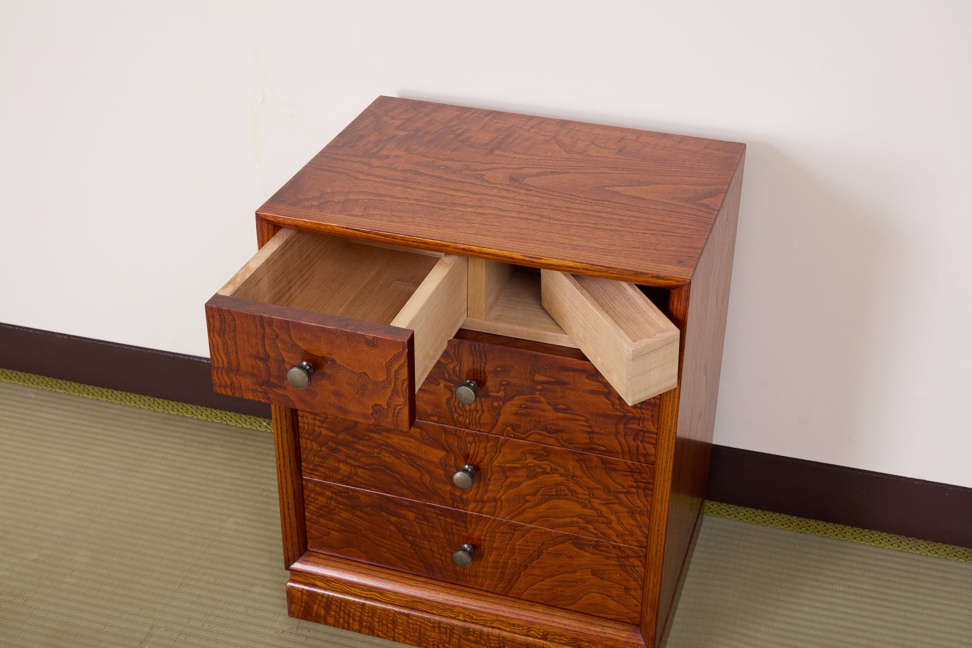 カラクリタンス001は多くの桐材から僅かにしか取れない桐の美しい杢を生かし、伝統工芸士会会長の三本和好氏が制作しました。伝統工芸士として誇りをかけた技術の粋を尽くした逸品です。2つと同じ物は出来ない、あなただけの宝物となります。