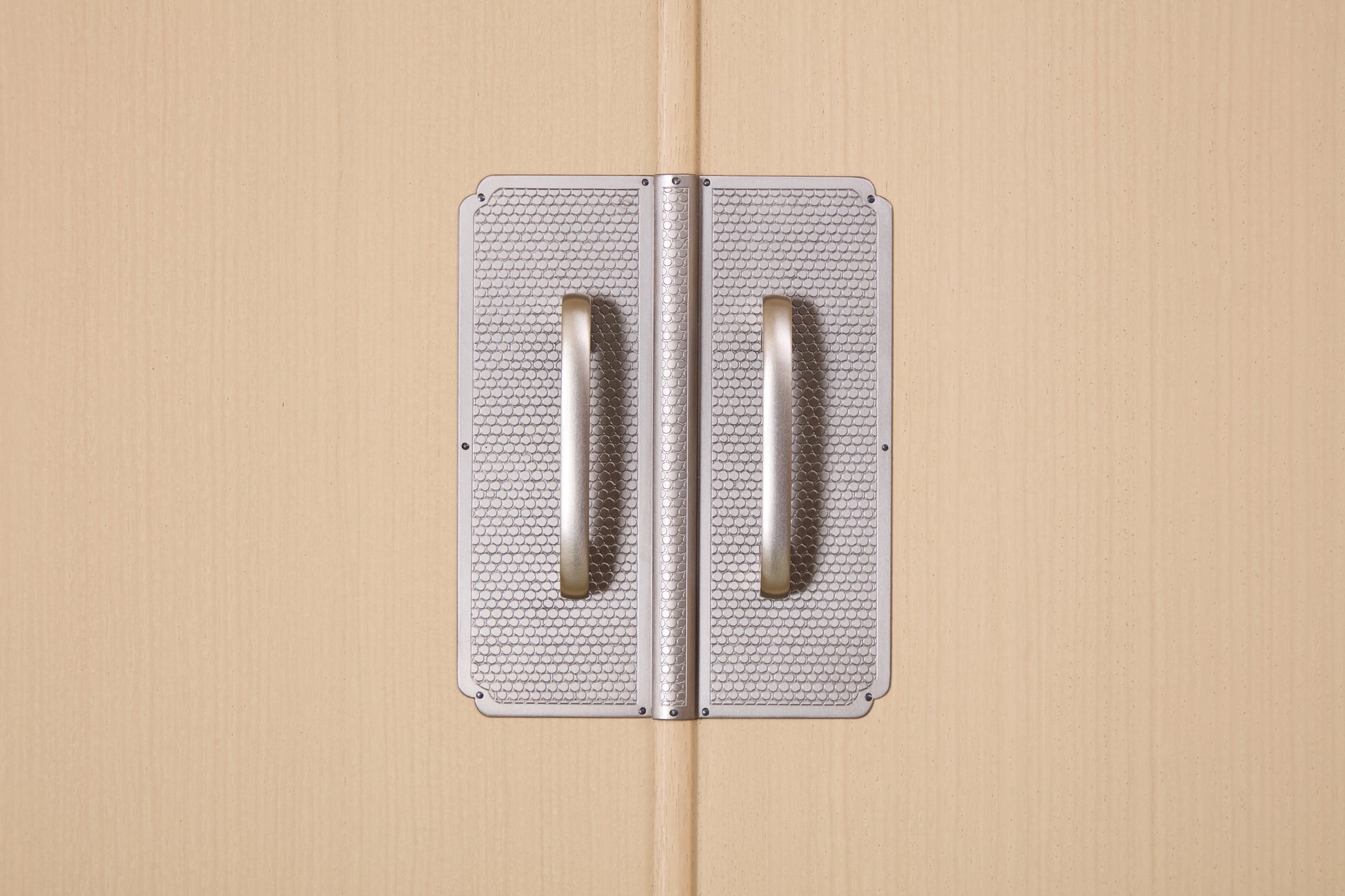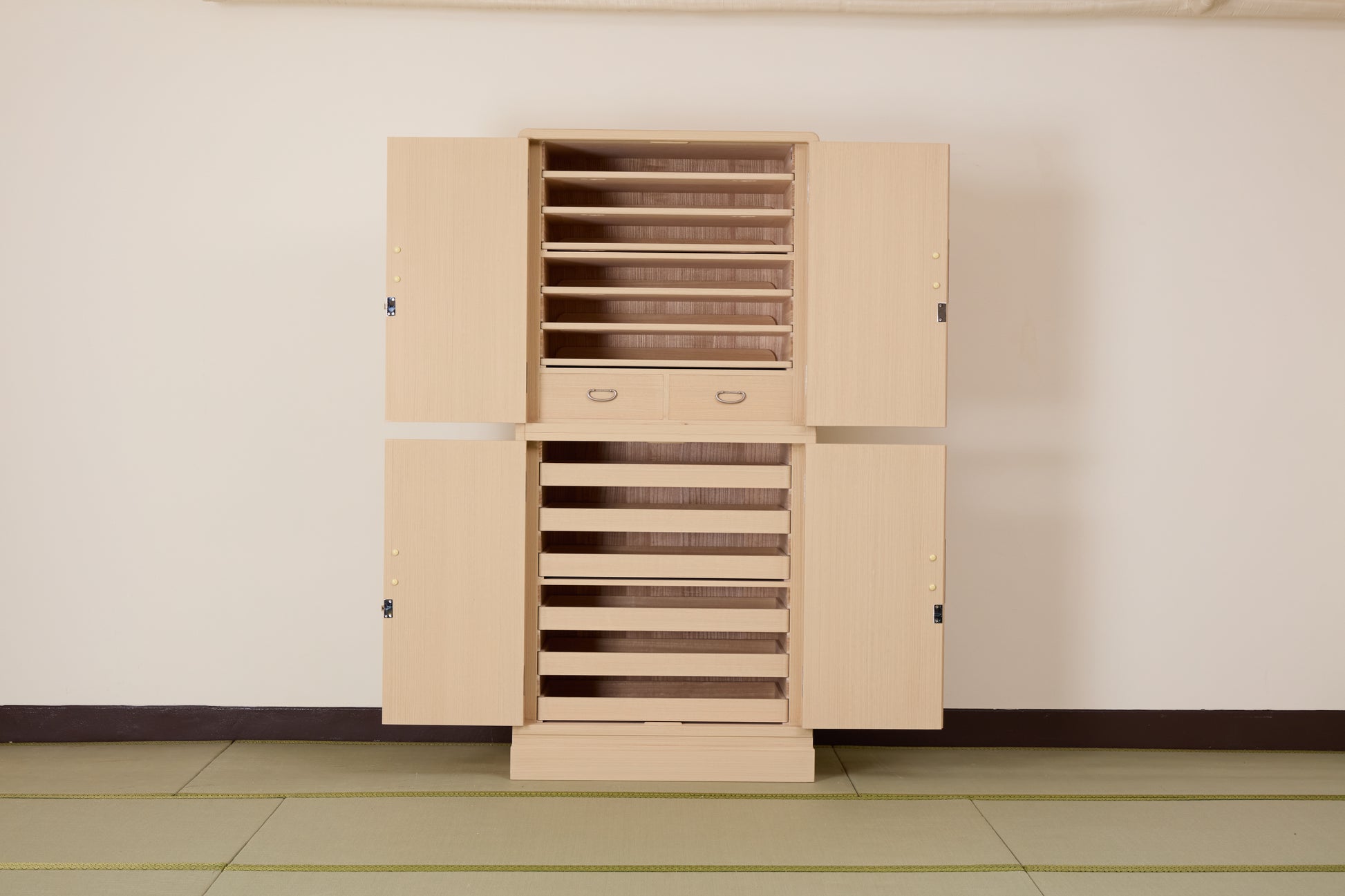 - 帯用のタトウ紙が収納可能なサイズで、上の扉の中には帯が見やすく出し入れしやすい 板盆6枚と小物収納用の小引出が2杯付いておりを備えています。