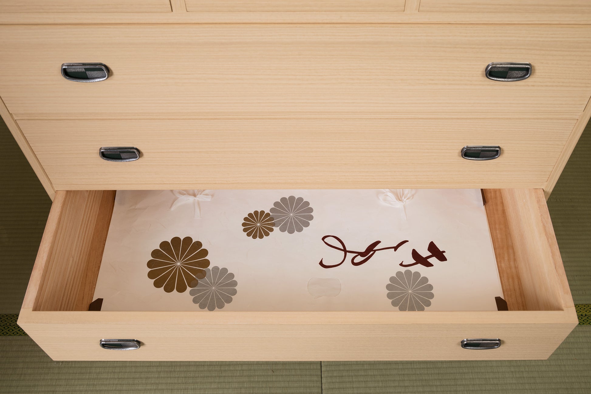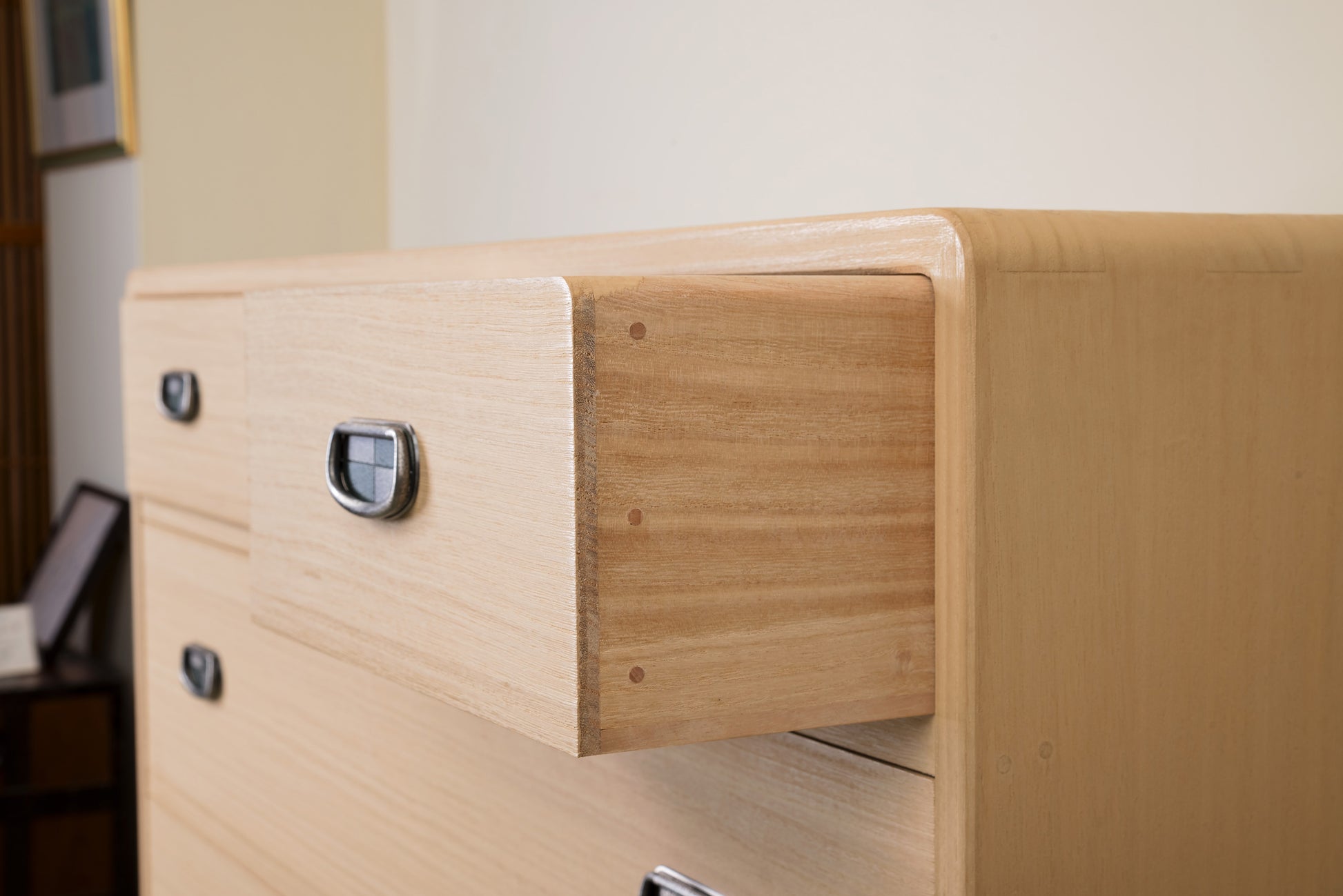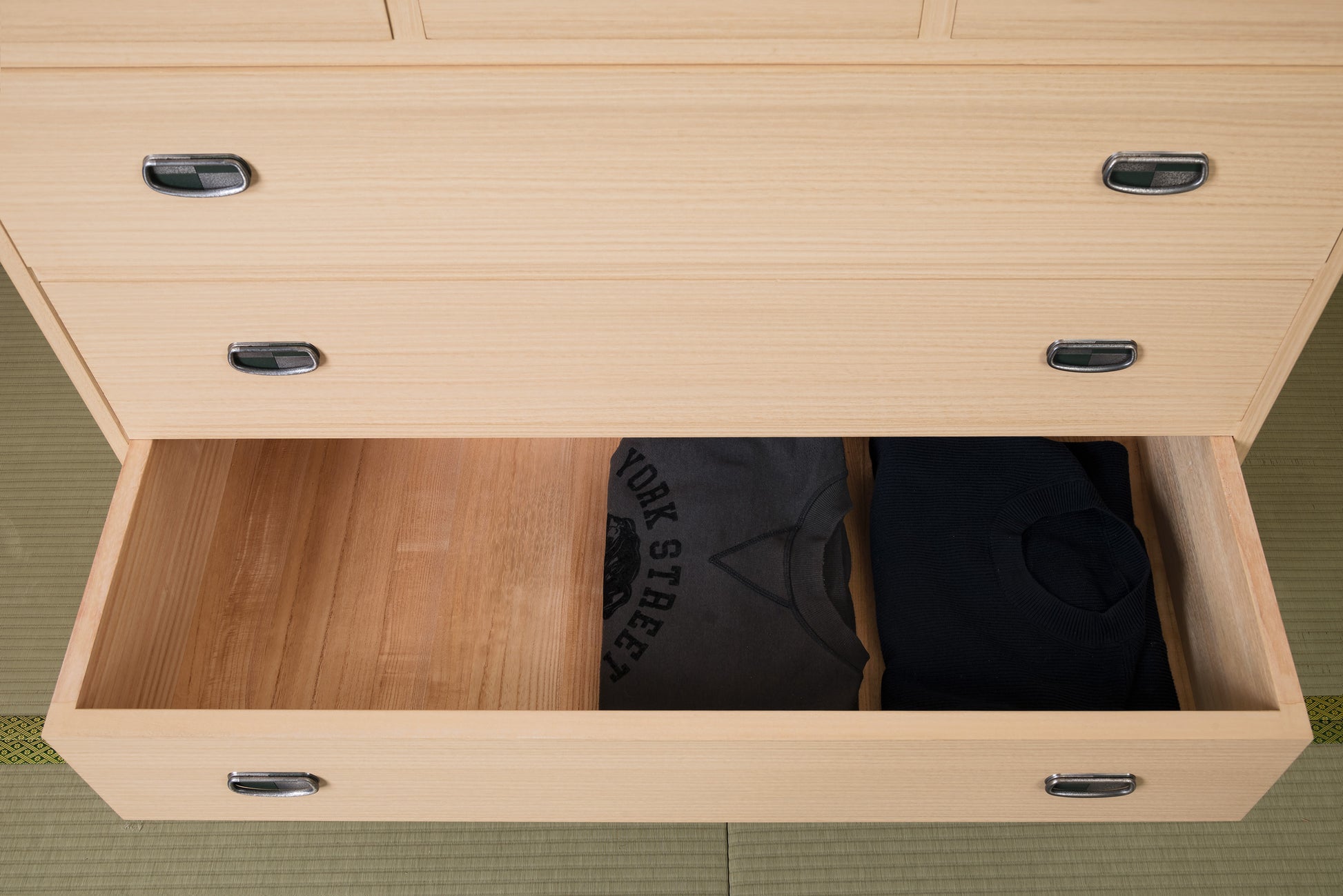 - 厚めの引出は着物だけでなく洋服などの幅広いアイテムの収納にも適しています。