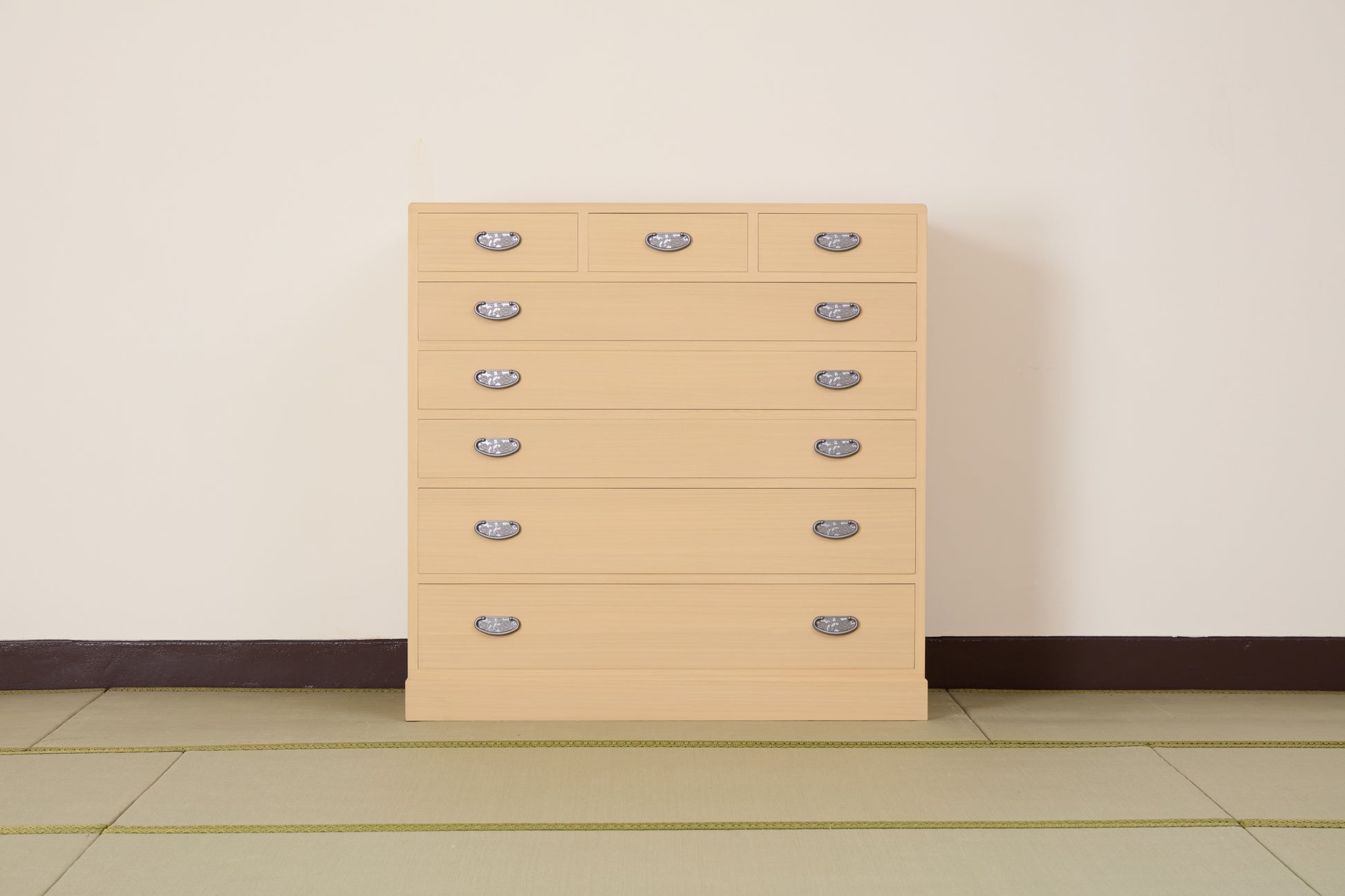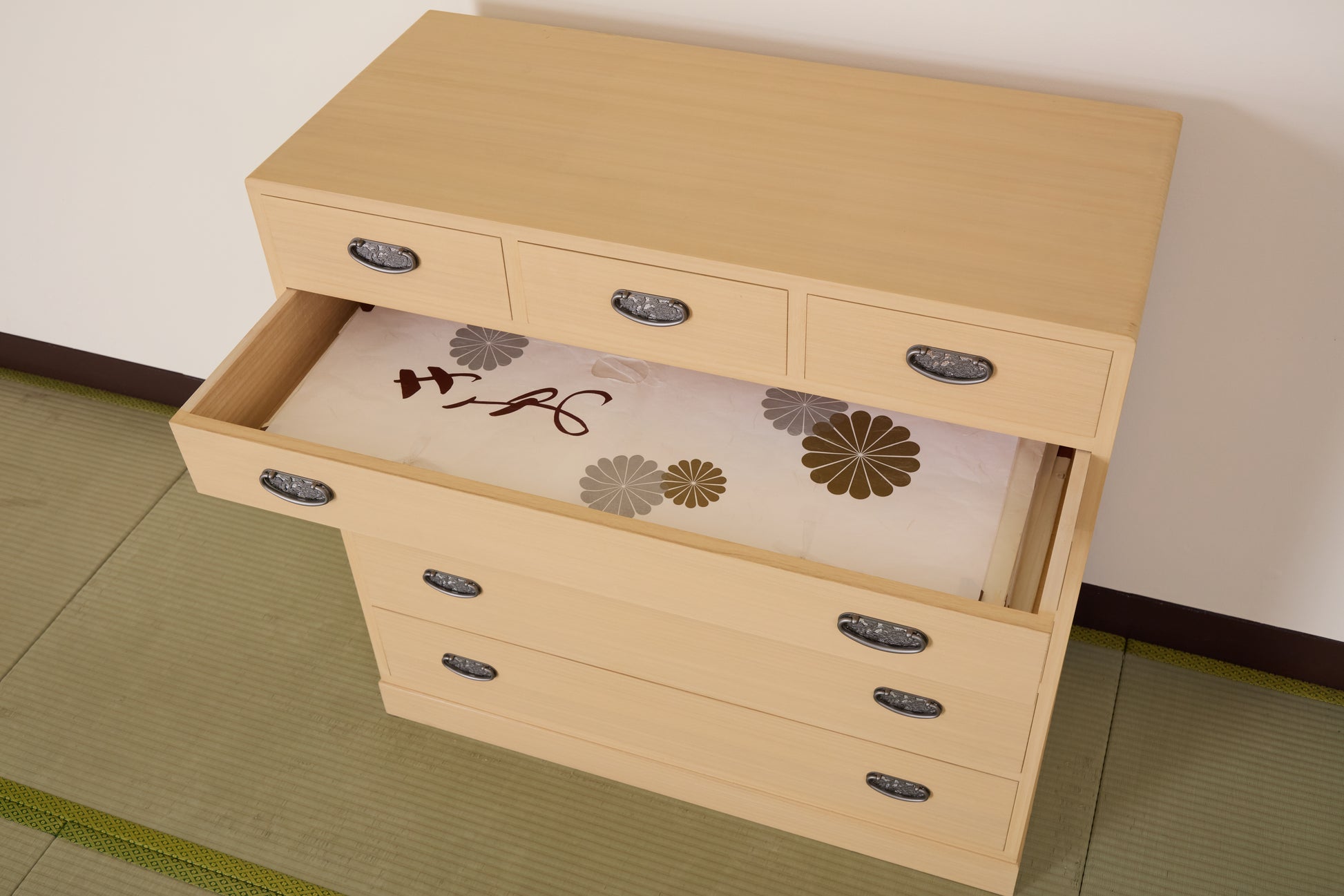 - 下2段は深い引出で和洋どちら収納でき、上段は薄い引出3段、最上段は小引出が3杯ついています。