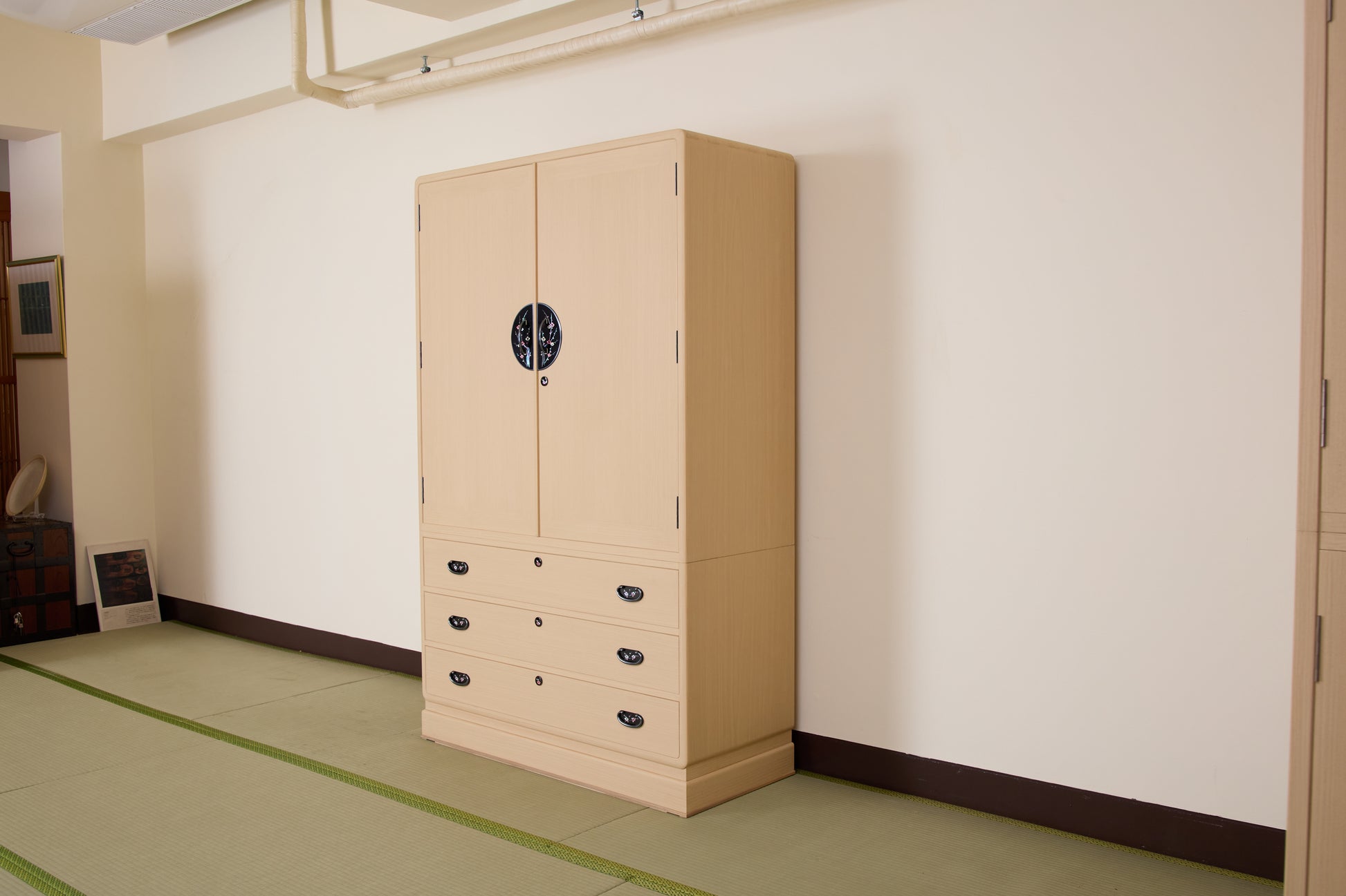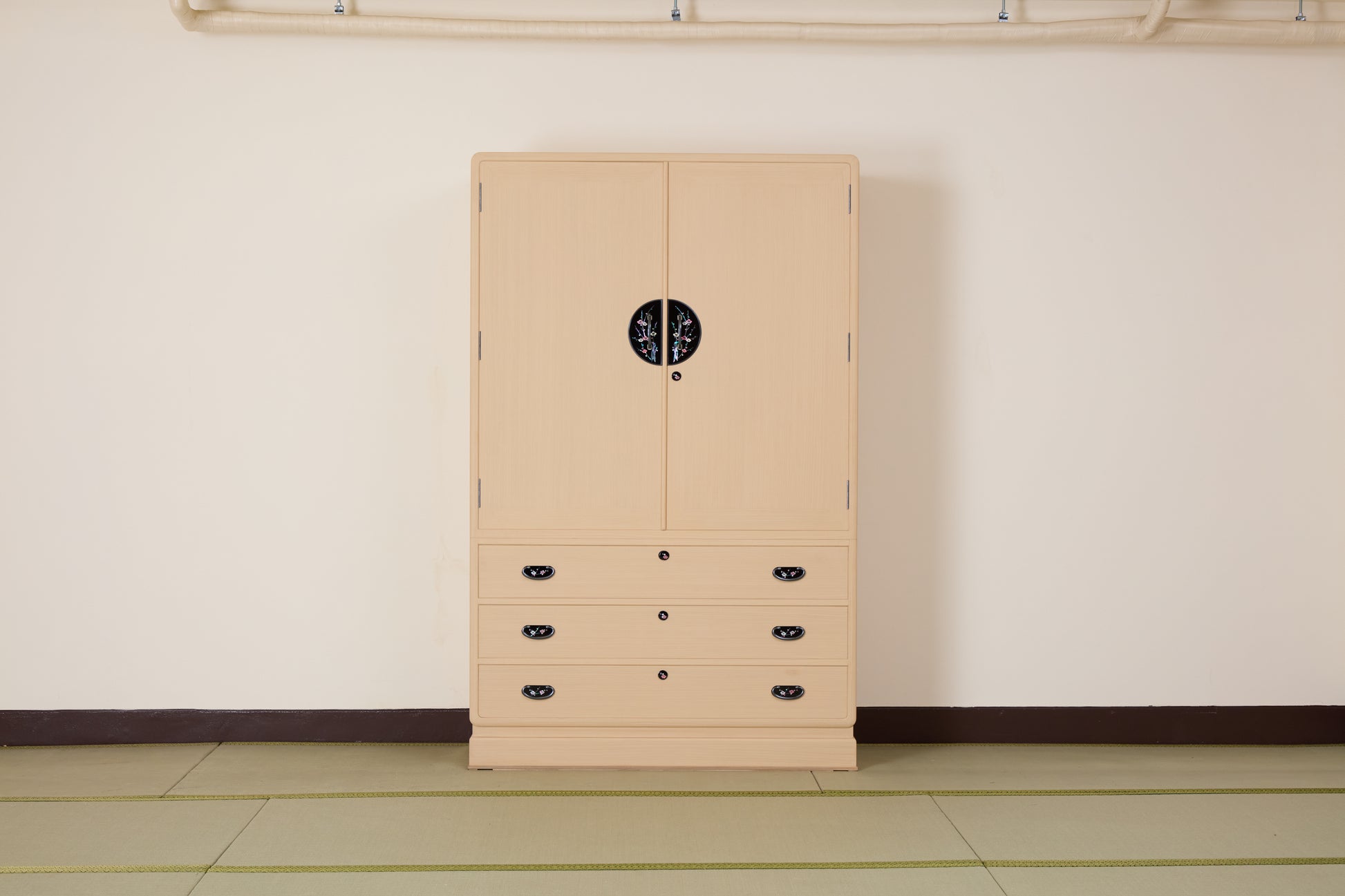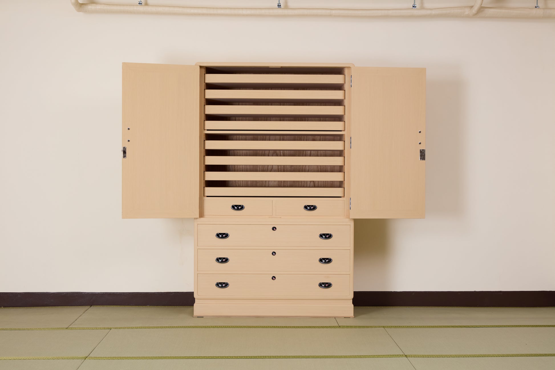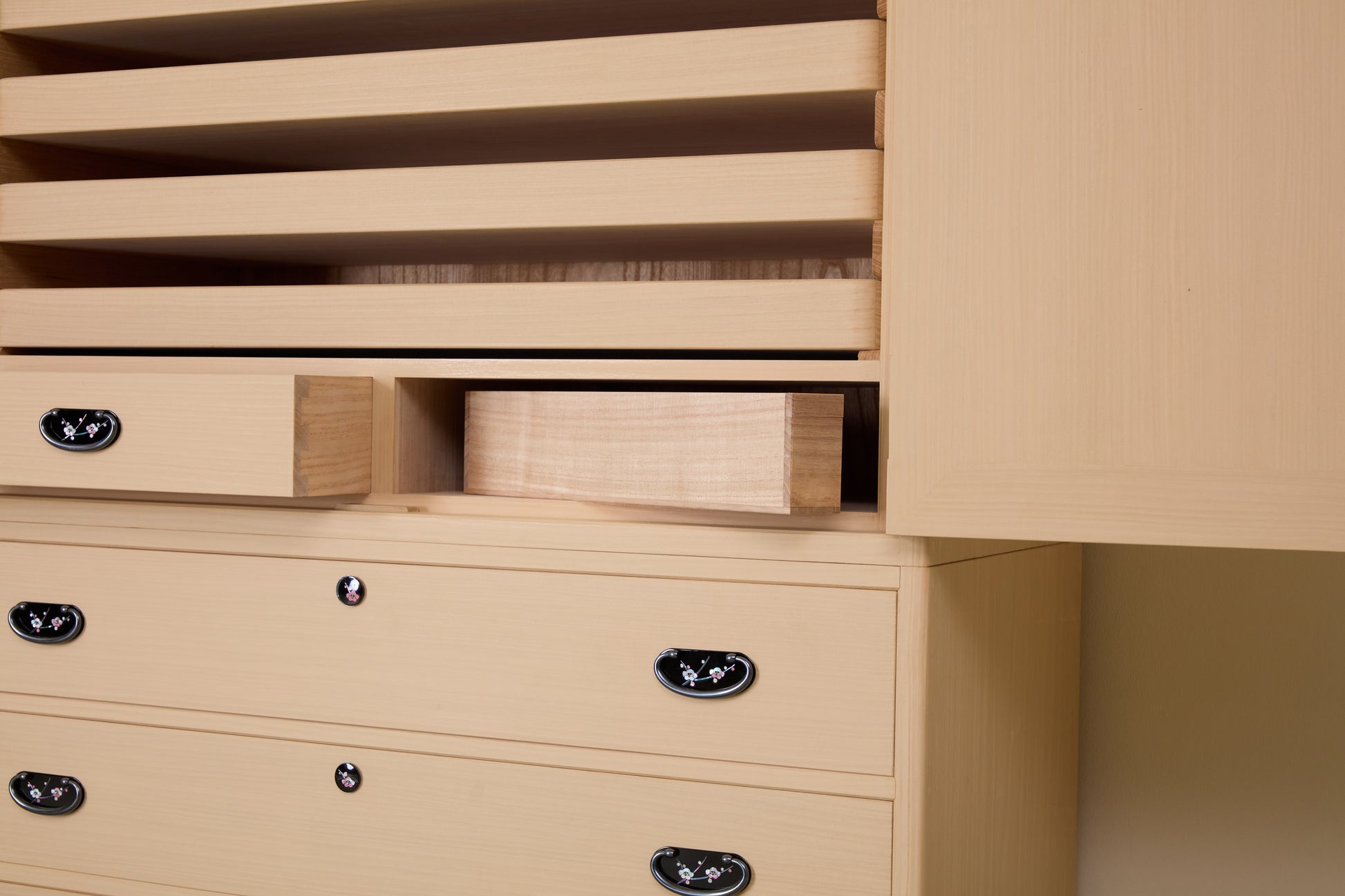 数百本の桐材の中から僅かにしか取れない、桐の柾目の無垢板(積層していない材)を用いて作成したものです。通常は表面の柾目の板は3~4㎜程度のものが使われますが、このタンスは20~27㎜の柾目の厚板で作ります。現在では良質な桐も産出されなくなり、このようなタンスは今後もう製造されることは無いでしょう。